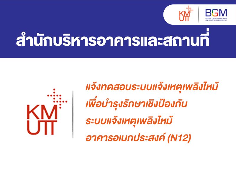 แจ้งทดสอบระบบแจ้งเหตุเพลิงไหม้ เพื่อบำรุงรักษาเชิงป้องกันระบบแจ้งเหตุเพลิงไหม้ อาคารอเนกประสงค์ (N12)